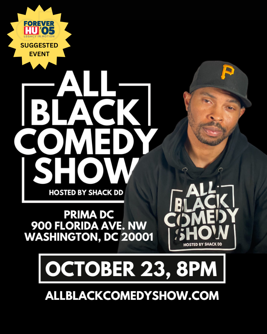 EVENT DETAILS: Get a ticket to come kick it! ALL BLACK COMEDY SHOW is going down like a fat chick with no knees at Howard Homecoming. You can expect the show to start on time at 8PM at Prima DC, conveniently located in NW DC near Howard University.